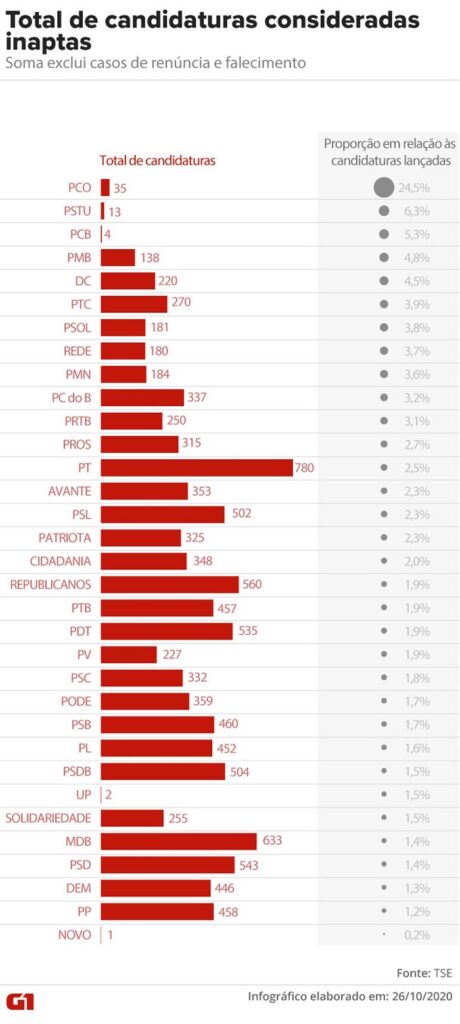 A distribuição das candidaturas inaptas, sem considerar os falecimentos e as renúncias, mostra que os partidos pequenos se destacam. O G1 calculou a proporção de inaptos em relação ao total de candidaturas lançadas por cada legenda. Pela ordem, partidos como PCO, PSTU, PCB, PMB e DC apresentam percentuais maiores que a média.