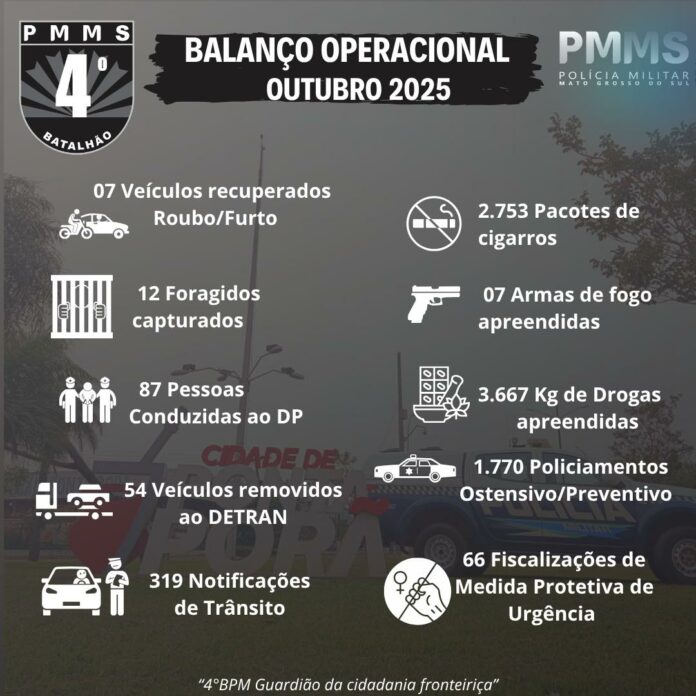 O 4° Batalhão de Polícia Militar de Ponta Porã divulgou o balanço operacional referente ao mês de outubro de 2025, apresentando resultados expressivos nas ações de policiamento ostensivo e preventivo realizadas em toda a área de atuação, que abrange os municípios de Ponta Porã, Aral Moreira, Antônio João, além dos distritos de Nova Itamarati e Sanga Puitã.
