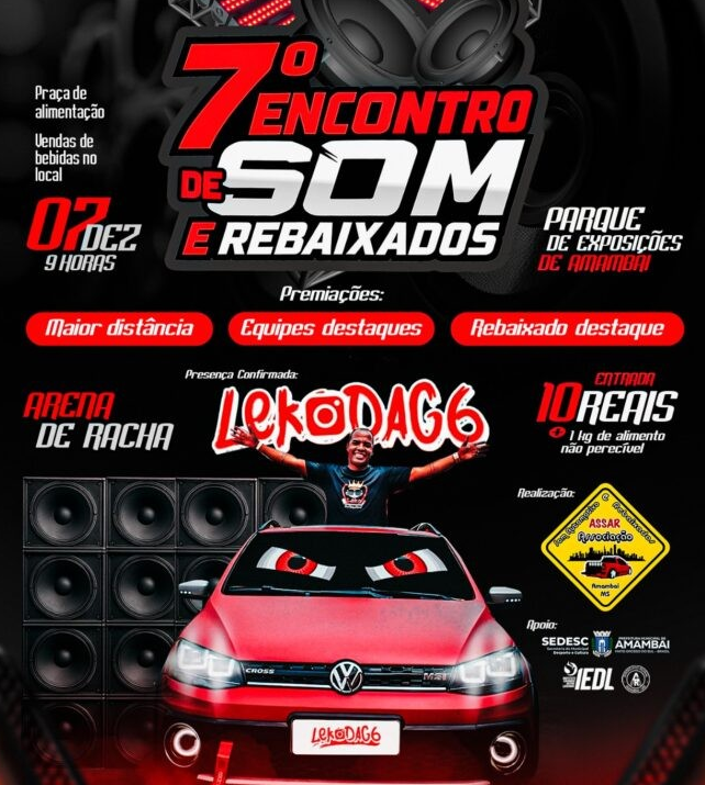 O Parque de Exposições de Amambai recebe o 7º Encontro de Som e Rebaixados neste domingo, dia 7 , a partir das 9h. O evento contará com a participação de entusiastas de diversas cidades da região, como Caarapó, Dourados, Iguatemi, Juti, Ponta Porã, Rio Brilhante e Tacuru, entre outras.