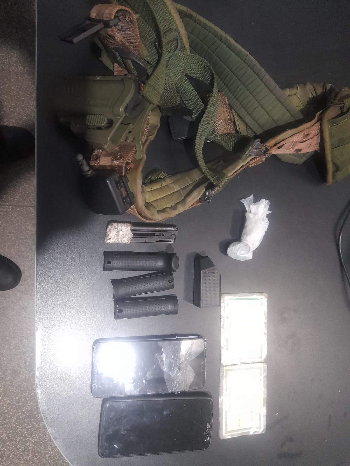 No local, os policiais encontraram um carregador de pistola calibre .22, acessórios de armamento, um suporte de munições, além de uma porção de maconha, totalizando pouco mais de 8 gramas. Também foram apreendidos os celulares danificados pelo autor, um carregador de pistola de cal. 22, três (3) backtraps (empunhadeira traseiras para pistola de pistolas GLOCK); um (01) suporte de munições. Ainda, com o autor, os policiais apreenderam dois documentos de identidade com nomes distintos e ambos com a foto do autor, sendo um original e o outro o autor admitiu ser falsificado.