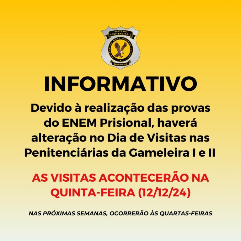 A Agepen (Agência Estadual de Administração do  Sistema Penitenciário) informa que, em virtude da aplicação das provas do ENEM PPL (Exame Nacional do Ensino Médio para Privados de Liberdade), nos dias 10 e 11 de dezembro, as visitas de familiares de custodiados na Penitenciária da Gameleira 1 e na Penitenciária da Gameleira 2 serão realizadas na quinta-feira (12.12), com os mesmos horários estabelecidos no calendário regular.