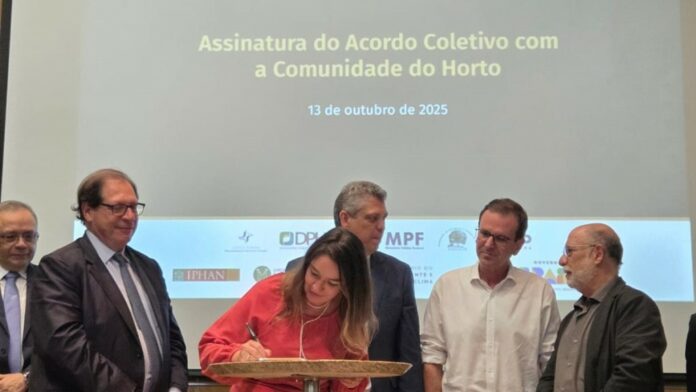 A Advocacia-Geral da União (AGU) participou da celebração do acordo coletivo que coloca fim a uma disputa judicial de mais de 40 anos e possibilita a permanência da Comunidade do Horto Florestal em área atualmente de propriedade do Instituto de Pesquisas Jardim Botânico do Rio de Janeiro (JBRJ) – instituição vinculada ao governo federal. A assinatura aconteceu na última segunda-feira (13/10), na Escola Nacional de Botânica Tropical, no Rio de Janeiro.