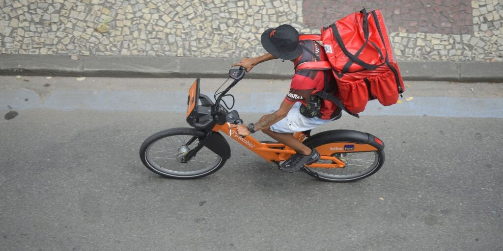 Rio de Janeiro (RJ), 15/02/2023 – Trabalhador de entrega por aplicativo percorre ruas no centro do Rio de Janeiro. Foto Tomaz Silva/Agência Brasil Rio de Janeiro (RJ), 15/02/2023 – Trabalhador de entrega por aplicativo percorre ruas no centro do Rio de Janeiro. Foto Tomaz Silva/Agência Brasil