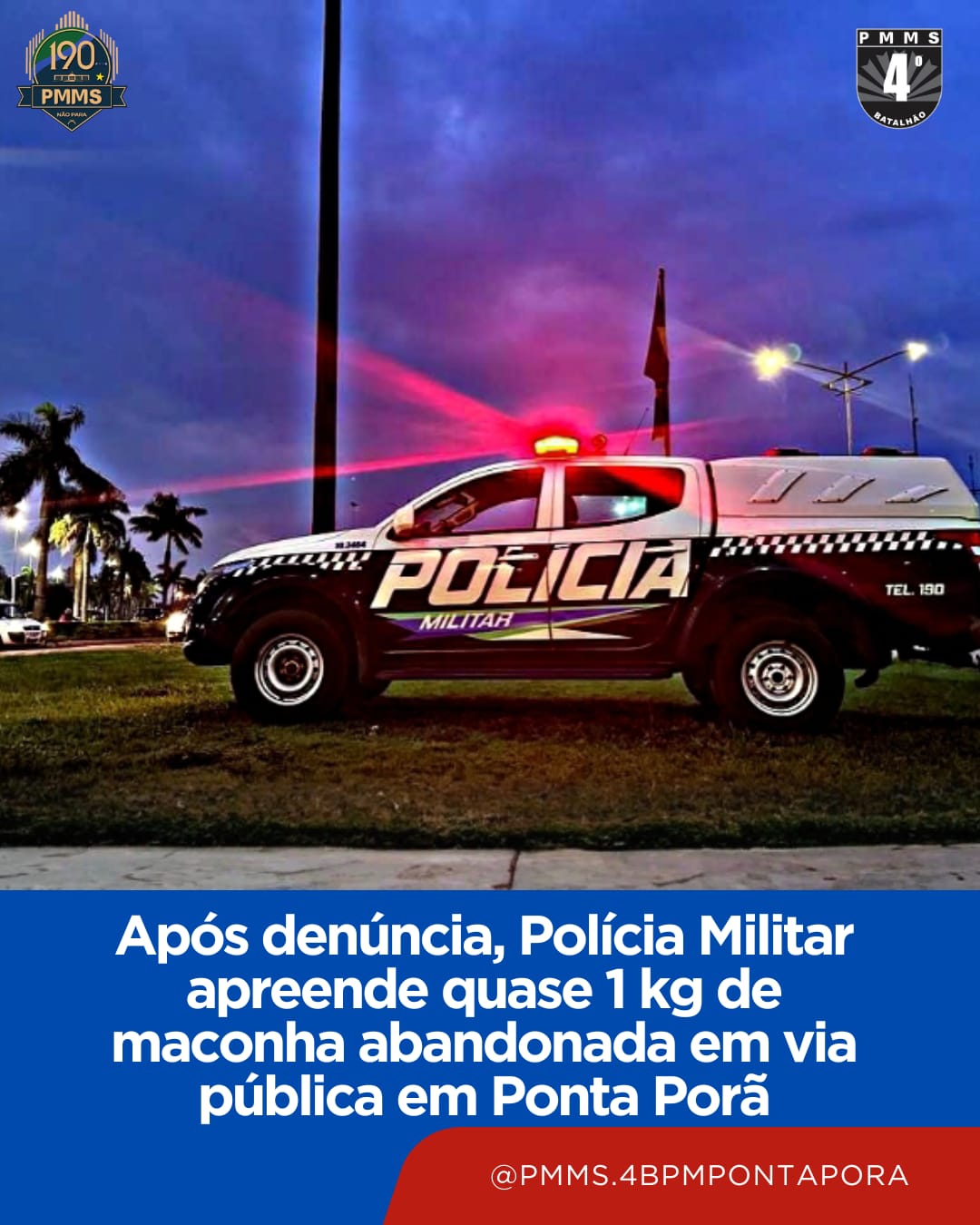 Nesta segunda-feira (6), a Polícia Militar apreendeu aproximadamente 834 gramas de maconha que estava jogada na rua, no Jardim Coimbra, em Ponta Porã (MS). A apreensão ocorreu após denúncia feita por um morador que observou, próximo a um pé de eucalipto, um tablete de maconha, embalado com fita adesiva.