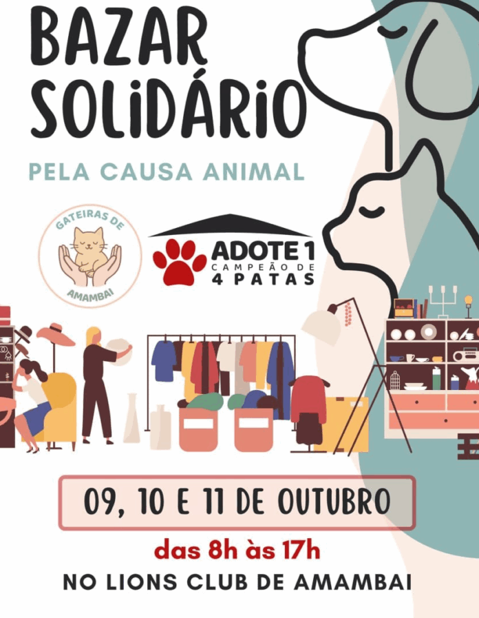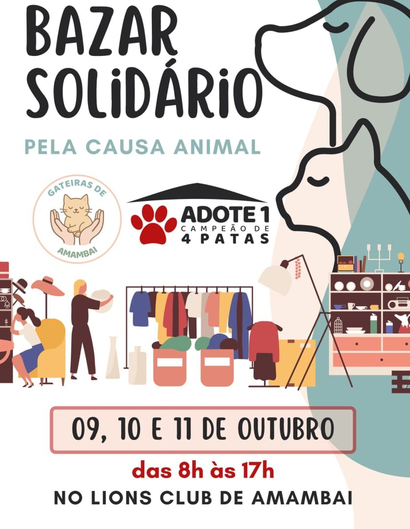 O Bazar Solidário pela Causa Animal, acontece nos dias 9, 10 e 11 de outubro, das 8h às 17h, no Lions Club de Amambai.