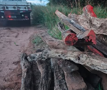 No local, foi constatado que um caminhão havia sido utilizado para o transporte irregular de lascas de madeira pertencentes à propriedade, sendo localizadas aproximadamente 25 unidades, com cerca de 2 metros de comprimento cada, já descarregadas no interior da fazenda.