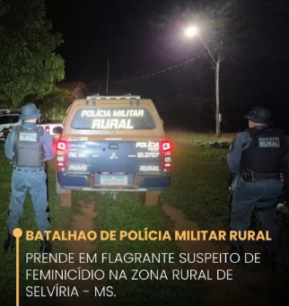 O Batalhão de Polícia Militar Rural prendeu, neste domingo (08), o suspeito de envolvimento em um caso de feminicídio ocorrido no Assentamento São Joaquim, na região de Selvíria/MS.