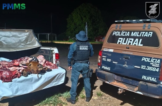 Durante patrulhamento pela MS-338, a equipe abordou um veículo que transportava carne bovina de forma irregular. No decorrer da ocorrência, foi constatado que o animal havia sido abatido sem autorização do proprietário. Em diligências, os policiais também localizaram uma arma de fogo e munições sem registro, além de restos do animal abatido.
