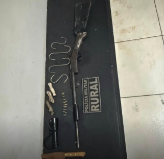 A equipe abordou o condutor de uma motocicleta e, durante vistoria em uma mochila que ele portava, localizou uma espingarda calibre .22, com mira laser acoplada, além de apetrechos comumente utilizados para caça, como facas, cordas, lanterna e ganchos.