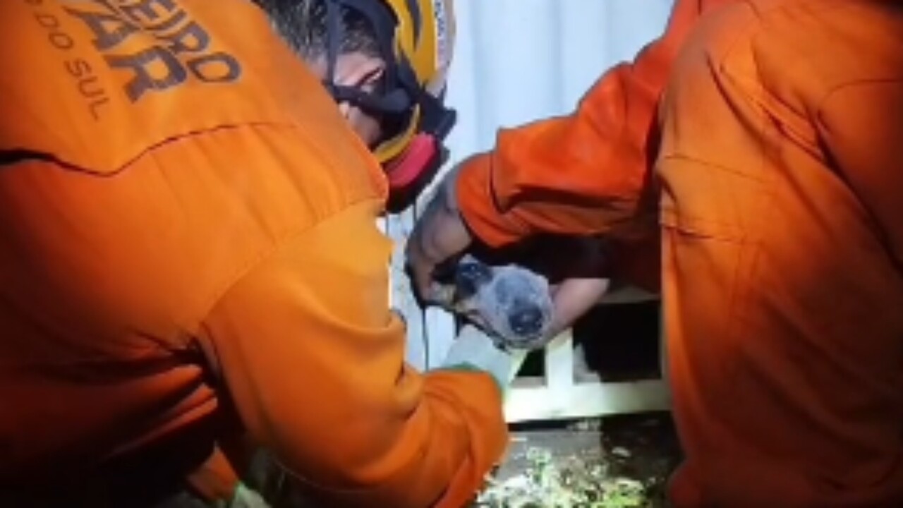 A equipe também precisou acalmar o cão durante o processo de salvamento.