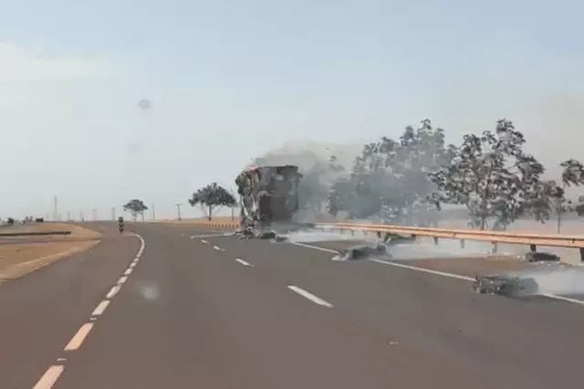 Em outra gravação, um carro segue pela pista da esquerda enquanto pedaços da carga em chamas caem pela rodovia. Ao se aproximar da carreta, é possível ver a estrutura sendo destruída pelo fogo.
