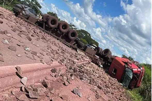 Conforme informações encaminhadas à reportagem, o acidente ocorreu próximo à ponte e resultou no espalhamento da carga de ferro gusa na pista. O veículo ficou tombado no meio da rodovia, ocupando parte considerável da via e deixando apenas um pequeno espaço livre em um dos acostamentos.