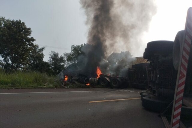 Acidente envolvendo duas carretas interditou totalmente a BR-262 na manhã desta sexta-feira (13), no trecho entre os municípios de Água Clara e Ribas do Rio Pardo, respectivamente. Os veículos colidiram frontalmente e um deles pegou fogo.