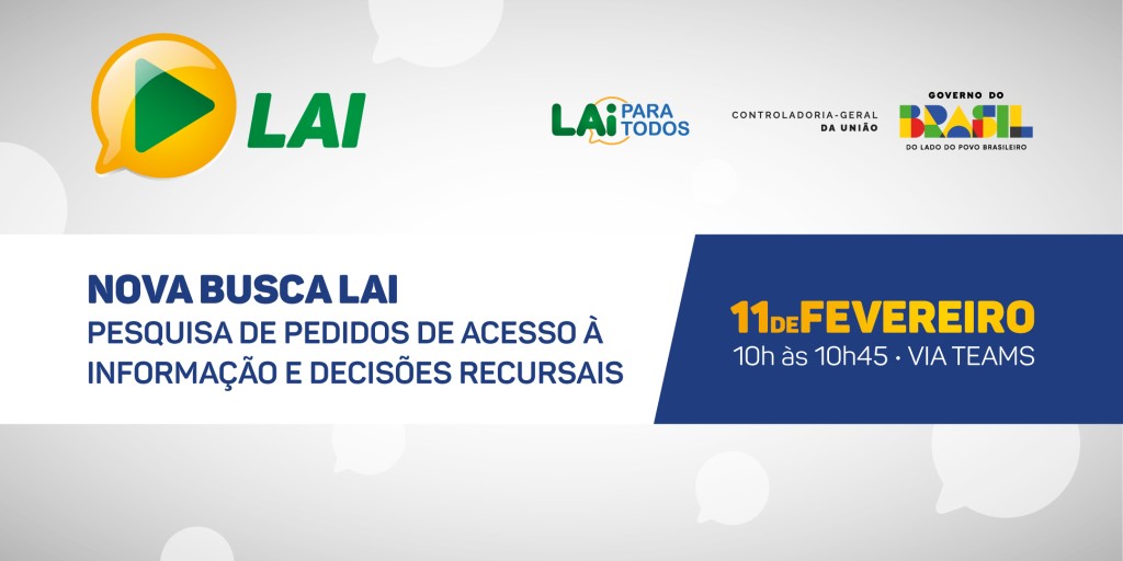 A Controladoria-Geral da União (CGU) realizará, no dia 11 de fevereiro, uma live para apresentar a Nova Busca LAI: pesquisa de pedidos de acesso à informação e decisões recursais, uma ferramenta mais moderna, eficiente e inovadora para a consulta de pedidos de acesso à informação e decisões recursais, no âmbito do Poder Executivo federal.