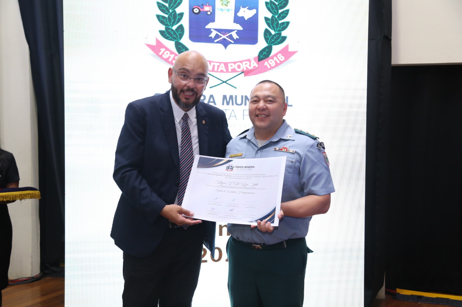 Já o 1º Tenente PM Allain Fernando de Figueiredo Salomão foi destacado pela Câmara Municipal por sua dedicação, comprometimento e resultados expressivos no exercício de suas funções, recebendo a medalha que representa uma das mais altas distinções do legislativo pontaporanense.