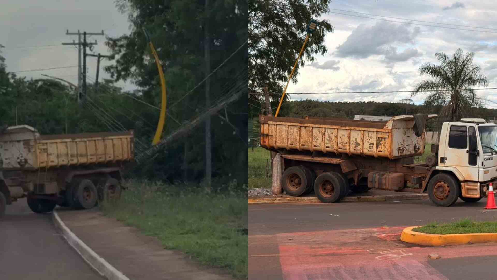 Imagens encaminhadas pelo Canal Fala Povo mostram o caminhão parado ao lado de um poste destruído, em meio aos fios de energia elétrica. O veículo teria colidido primeiro contra outro poste, no meio do canteiro.