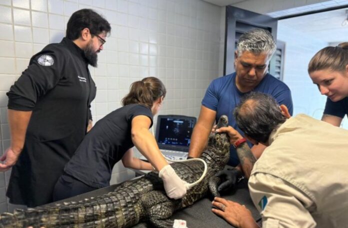 A bióloga-chefe do Bioparque Pantanal, Carla Kovalski, reforça a relevância dos procedimentos. “Realizamos os procedimentos de biometria, ultrassonografia e coleta de sangue dos jacarés como parte dos protocolos de manejo do Bioparque. Essas ações envolvem uma equipe multidisciplinar e são fundamentais para acompanhar tanto o desenvolvimento dos animais quanto a manutenção da saúde e do bem-estar ao longo do tempo”, explicou.