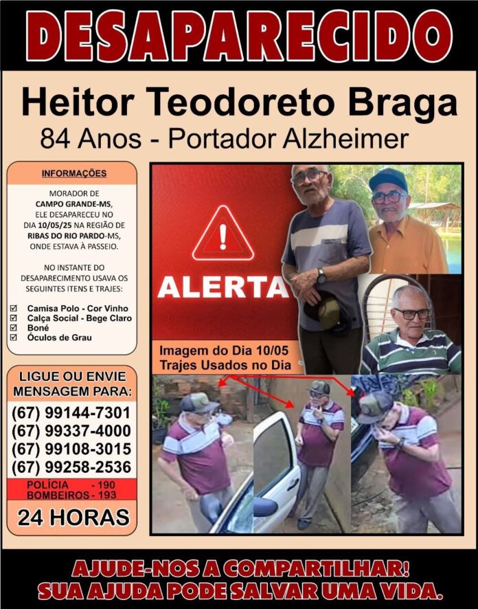 “Estou com meu avô desaparecido desde o dia 10/05 , sumiu na regiao de Ribas do Rio Pardo ele estava em um assentamento com o meu tio, filho dele ! Não temos nenhuma noticia para onde ele possa ter ido , os bombeiros fizeram buscas na mata porem nao tivemos nenhuma pista o que fizeram os bombeiros encerrar e pensar também na possibilidade de ter pego carona ! Ele e portador da doença de Alzheimer e quando perguntavamos onde ele morava ele falava ponta pora pois ja morou quando pequeno ! A familia é de Campo Grande aqui a noticia esta bem repercurtida mas nao tivemos nada que nos levasse ate ele ! Estamos tentando contatos em Ponta Porã para nos ajudar a divulgar. Ficaria muito agradecida se voce nos respondesse e nos ajudasse colocando no jornal”