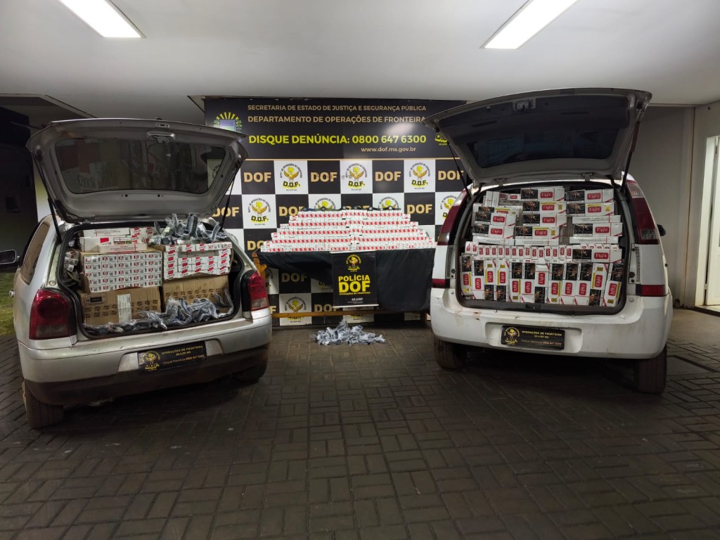 Policiais militares do DOF (Departamento de Operações de Fronteira) apreenderam, na noite de segunda-feira (26), dois veículos carregados com 3 mil pacotes de cigarros contrabandeados do Paraguai e fardos de produtos de descaminho. A ação ocorreu em uma casa no perímetro urbano de Dourados.