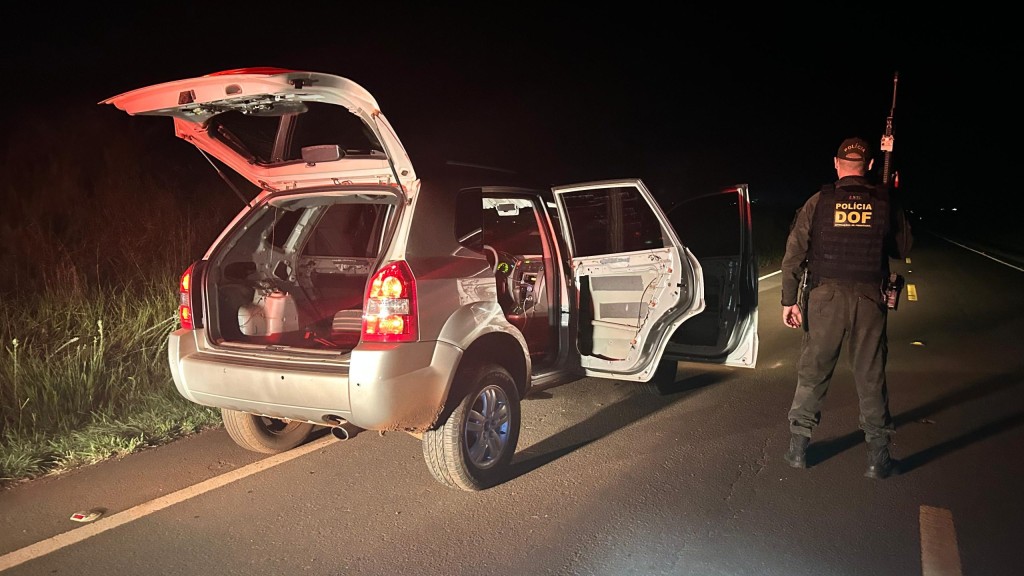 A equipe realizava patrulhamento pela rodovia quando visualizou o utilitário trafegando em alta velocidade e com alterações na suspensão. Ao receber ordem de parada, o condutor desobedeceu e iniciou fuga, abandonando o automóvel quilômetros depois e tentando escapar a pé por uma área de mata.