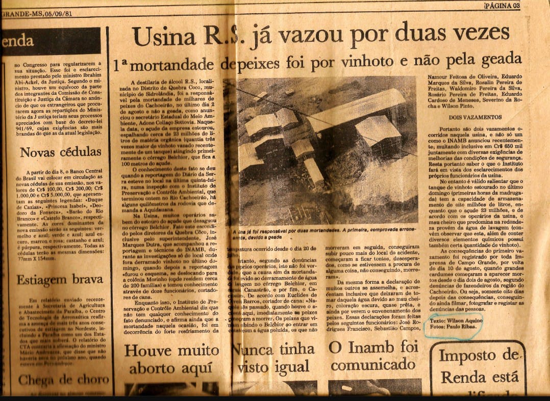 Naqueles anos eu vivia o auge da carreira, iniciada no fim da década de 70. Rumores apontavam para a Usina de Álcool Quebra Coco, em Sidrolândia. Ao lado do fotógrafo Paulo Ribas, segui para investigar, com a anuência do nosso editor-chefe, Silvio Martins Martinez. Fomos barrados na entrada, mas não me dei por vencido: conversei com funcionários que entravam e saíam da usina, além de moradores do entorno, que confirmaram o que já se comentava — a usina teria sido a responsável pelos desastres. De volta ao jornal, trouxe à tona essa suspeita, que virou manchete principal.