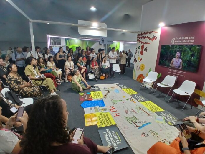 Ressaltar a força do protagonismo feminino no desenvolvimento de soluções frente às mudanças climáticas foi o tema principal da Roda de Conversa – Mulheres que Alimentam, realizada durante a Conferência das Nações Unidas sobre Mudanças Climáticas de 2025 (COP30), na tarde da terça-feira (19). O painel teve a mediação feita por Elisabetta Recine, presidenta do Conselho Nacional de Segurança Alimentar e Nutricional (Consea), e a participação dos enviados especiais: Janja Lula da Silva, enviada especial da COP30 para Mulheres e Paulo Petersen; enviado especial para Agricultura Familiar; Roberta Cardoso e Jaqueline Felipe do Grupo de Trabalho Mulheres da Articulação Nacional de Agroecologia (ANA).