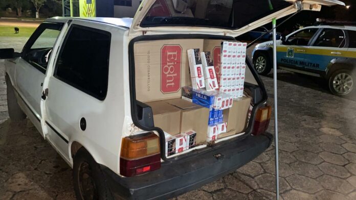Diante do fato, os policiais deram ordem de parada ao veículo e verificaram que havia dois indivíduos em seu interior. Constataram também que ambos transportavam no veículo 14 caixas de cigarros de origem estrangeira, sem a devida documentação legal.