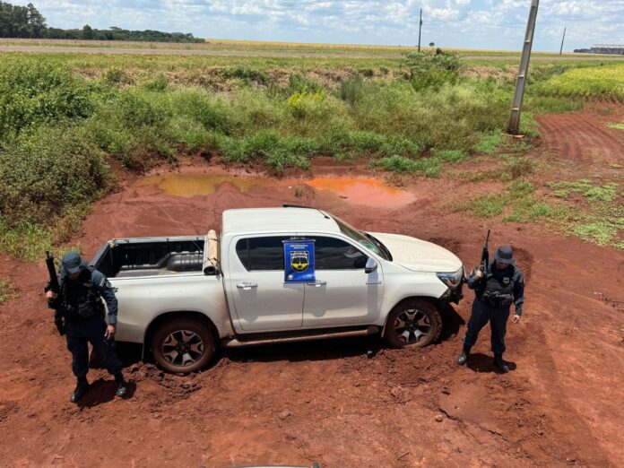 A Polícia suspeita que os criminosos tentavam levar a caminhonete para a fronteira, mas acabaram ficando atolados no local. O veículo estava sem a chave de ignição, indicando roubo mediante arrombamento.