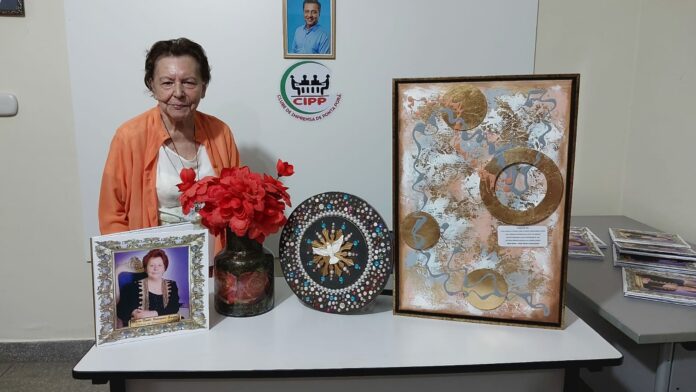 A artista plástica efetuou a doação de um quadro confeccionado com materiais recicláveis. É mais uma obra da ambientalista Maria Bonita, pois ela já efetuou outras doações ao Clube de Imprensa Oficial de Ponta Porã e que compõem o acervo da entidade.
