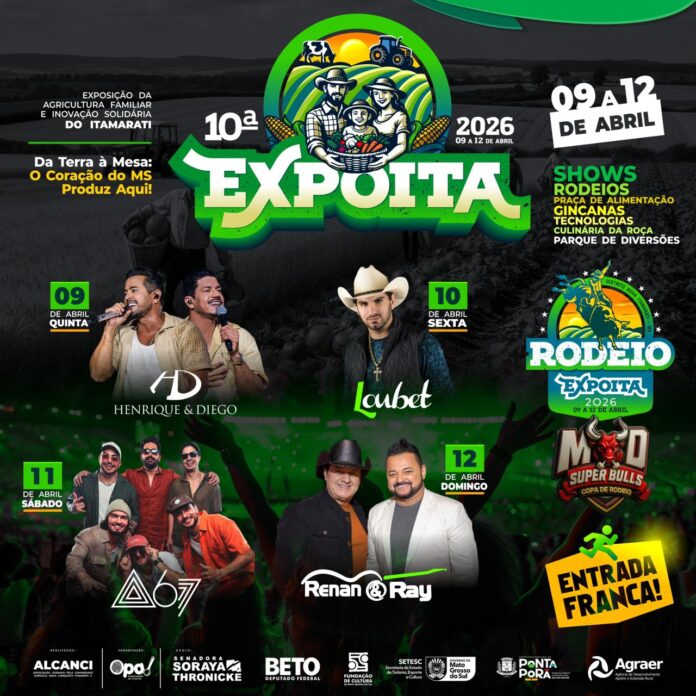 De 9 a 12 de abril, o distrito de Nova Itamarati, em Ponta Porã, será palco da 10ª edição da EXPOITA — Exposição da Agricultura Familiar e Inovação Solidária do Itamarati. Consolidada como um dos principais encontros dedicados à agricultura familiar no estado, a feira reúne produtores, instituições públicas, pesquisadores e investidores com o objetivo de fortalecer a produção rural, estimular a inovação no campo e ampliar as oportunidades de mercado para pequenos agricultores.