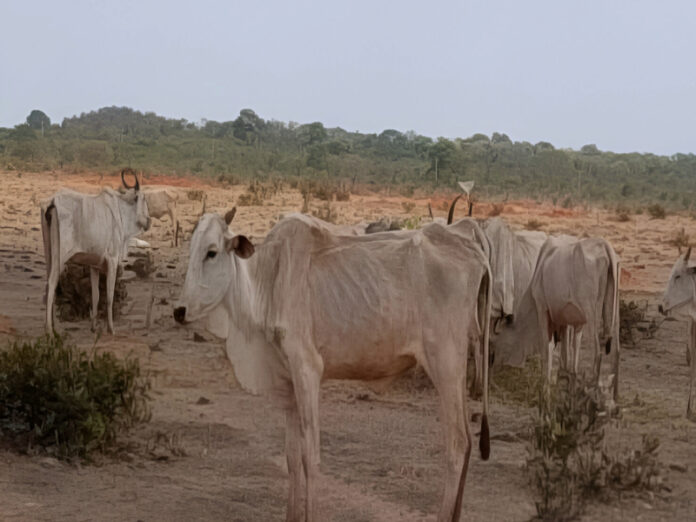 Relatório de fiscalização ambiental indica que os bovinos exibiam baixo escore corporal e sinais evidentes de fraqueza, resultado da ausência de alimento adequado.
