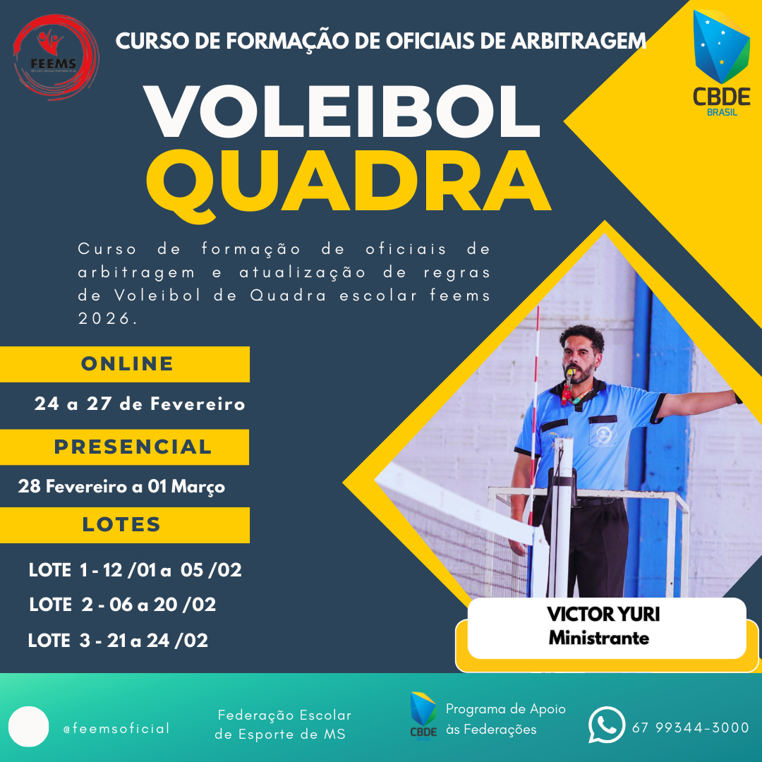A Federação Escolar de Esportes de Mato Grosso do Sul (FEEMS) informa que estão abertas as inscrições para o Curso de Formação de Oficiais de Arbitragem Escolar na modalidade Voleibol de Quadra, que será realizado no período de 24 de fevereiro a 01 de março de 2026.