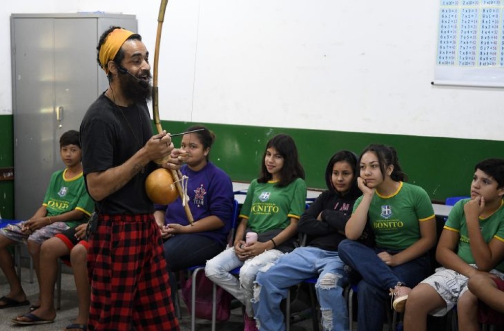 Alunos da 5° série da Escola Municipal Professora Durvalina Dorneles Teixeira, de Bonito, tiveram na manhã desta quinta-feira (24) a oportunidade de participar de uma contação de histórias. A atividade Mala de Viajante, de temática afroindígena, foi dirigida por Ricardo Lima, de Três Lagoas, para as crianças da escola.