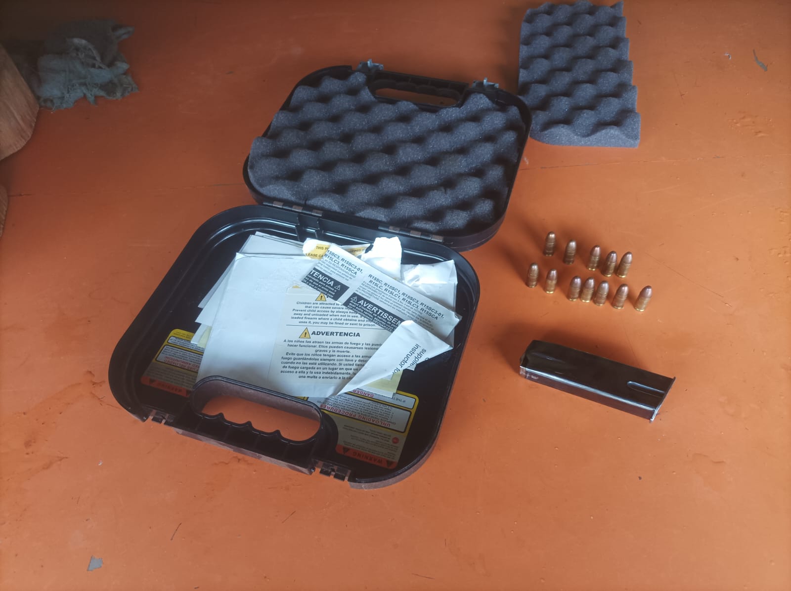 Durante a entrada e buscas no imóvel, foram encontrados um carregador de pistola contendo 12 munições de calibre 9mm e um tablete de maconha. No momento da operação, não havia moradores no local.