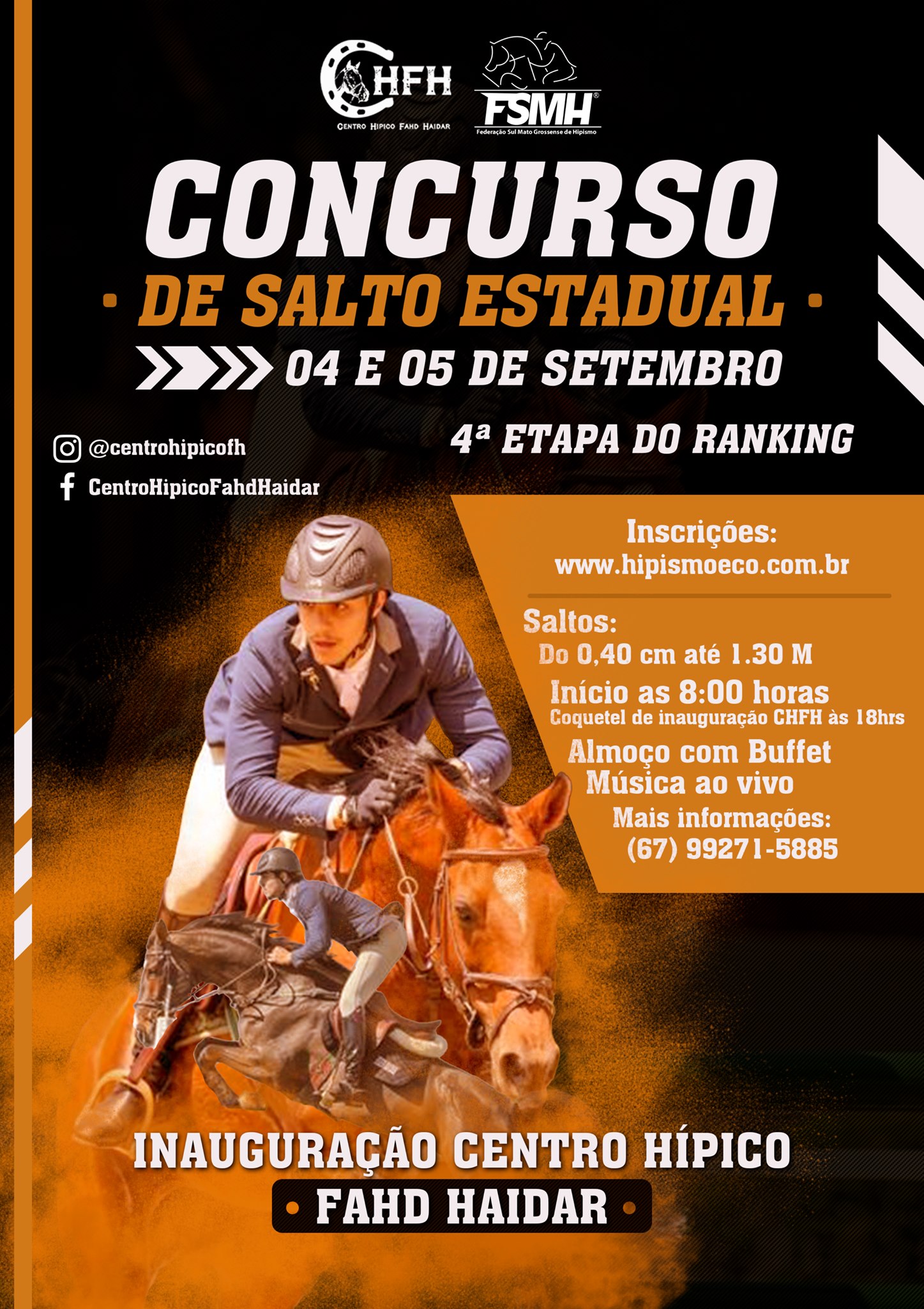 Ponta Porã conta com um local amplo e moderno para a prática de hipismo na cidade que é o Centro Hípico Fahd Haidar, localizado na Rodovia MS-386⠀e nesse fim de semana, mais precisamente sábado (4) e domingo (5) estará acontecendo o Concurso de Salto Estadual com saltos de 0,40 cm até 1,30 m da 4ª Estapa do Ranking. O evento terá início às 8h.