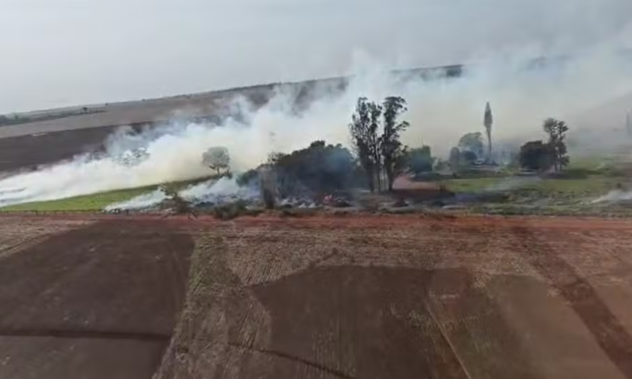 A Polícia Militar informou que os ocupantes expulsaram o caseiro e atearam fogo na sede da fazenda. As chamas se espalharam, formando densa fumaça sobre a área.