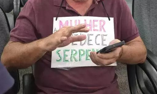 Homem não identificado foi retirado do plenário da Câmara Municipal durante a sessão desta terça-feira (10), após exibir uma placa com a frase “Mulher obedece a serpente” enquanto acompanhava os trabalhos legislativos sentado na primeira fileira.