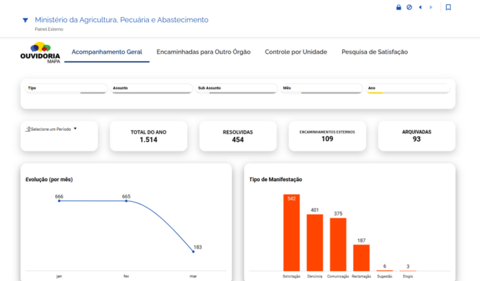 O Ministério da Agricultura e Pecuária (Mapa) lançou o novo Painel da Ouvidoria “AgroOUV ”. A iniciativa tem como objetivo oferecer ao cidadão uma visão clara e atualizada de como as manifestações são recebidas e processadas pelo órgão. No painel, é possível acompanhar o número de comunicações registradas, incluindo denúncias, reclamações, elogios e sugestões, garantindo mais transparência sobre o funcionamento do serviço.