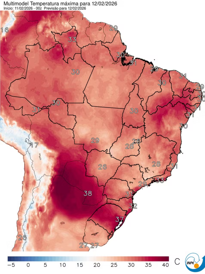 Uma massa de ar quente está se expandindo sobre a parte central da América do Sul e deve elevar as temperaturas em áreas do Sul, Sudeste e Centro-Oeste do Brasil nos próximos dias, às vésperas do Carnaval (veja MAPA abaixo).