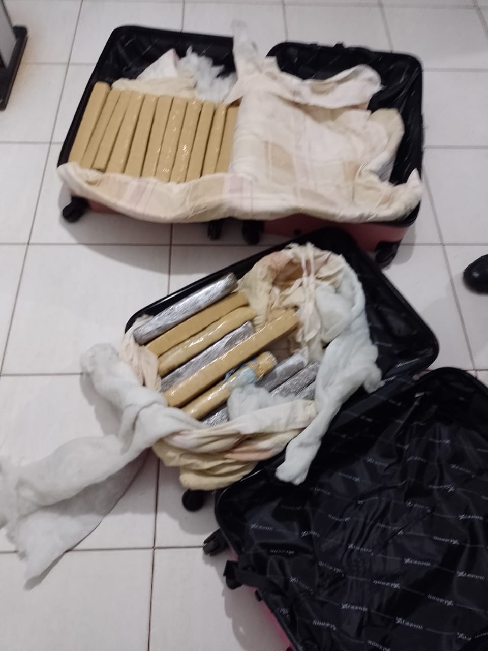 Diante da fundada suspeita, os agentes abordaram as duas e foi verificado que se tratava uma menor de idade identificada como A.A.S. (15) e a outra como T.C.S. (19) que disseram ser amigas e que só a menor iria viajar em um ônibus da Expresso Queiroz. Perguntado para as mesmas de quem seria as malas, a menor informou que as malas pertenciam a ela e ao serem abertas e feito a revista, foi localizado diversos tabletes de uma substância involucrada com fitas e com um forte odor aparentando ser substância análoga a maconha (cannabis sativa), totalizando 21 tabletes, pesando vinte quilos (20 kg).