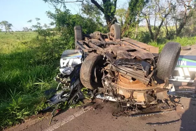 Imagens que chegaram ao Campo Grande News mostram muitos destroços, inclusive com buracos no trecho, e a viatura com o teto no asfalto, entre a pista e a vegetação.