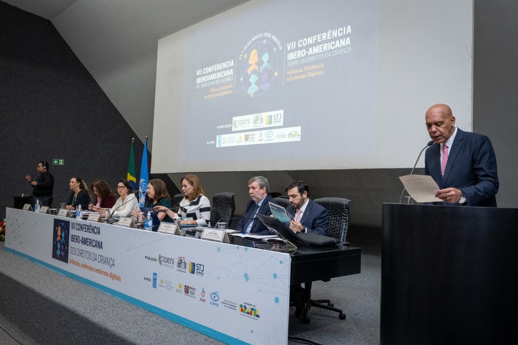 Brasília, 24/3/2026 – O Ministério da Justiça e Segurança Pública (MJSP) participou, nesta terça-feira (24), da VII Conferência Ibero-Americana dos Direitos da Criança, realizada no Superior Tribunal de Justiça (STJ), com o tema Infância, Violência e Entornos Digitais. A programação, transmitida em três idiomas, marca um momento decisivo para a cooperação internacional na garantia de direitos fundamentais em ambiente on-line. O encontro segue até esta quarta-feira (25).