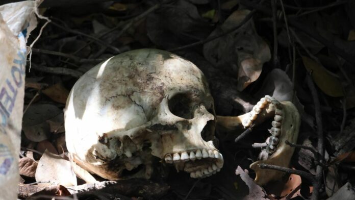 Nas imagens registradas pela reportagem, é possível ver perfeitamente o crânio, que ainda passará por perícia. O crânio estava ao lado de um saco branco.