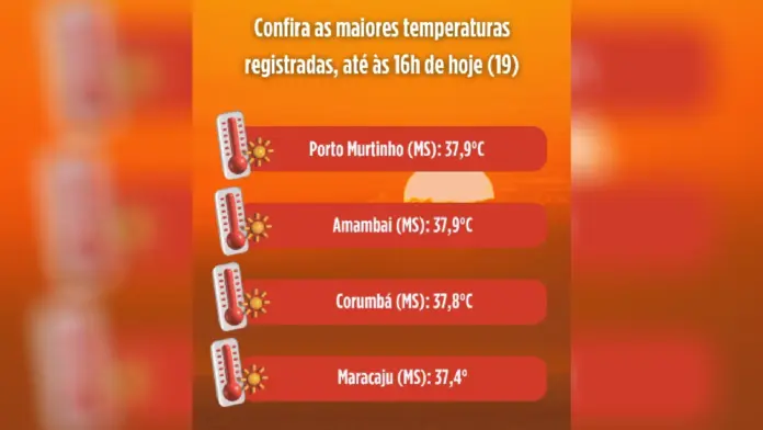 Os municípios de Porto Murtinho e de Amambai, na região sul do estado, lideraram a lista, com 37,9°C cada. Em seguida aparecem Corumbá, na região oeste, com 37,8°C, e Maracaju, com 37,4°C.