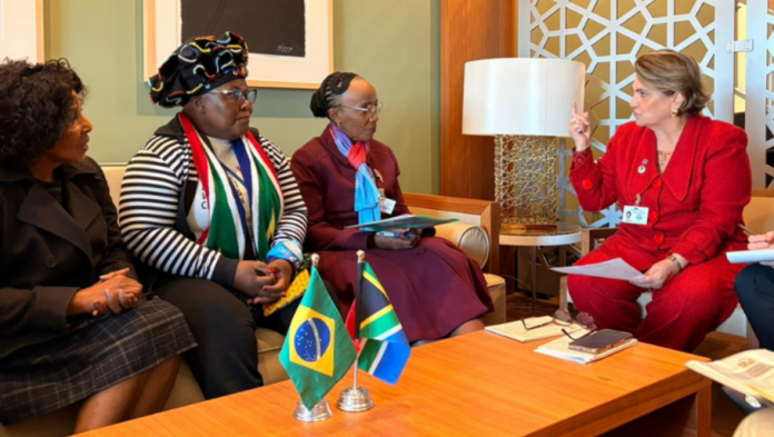 No encontro com a ministra das Mulheres, Juventude e Pessoas com Deficiência da África do Sul, Sindisiwe Chikunga, as gestoras dialogaram sobre iniciativas voltadas ao empoderamento econômico das mulheres, ao uso de tecnologias e inteligência artificial, à economia do cuidado e ao enfrentamento à violência digital.