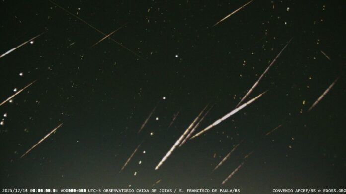 Chuva de asteroides Geminidas em São Francisco de Paula (RS), em dezembro de 2025. Foto: Eduardo Santiago/Projeto Exoss.