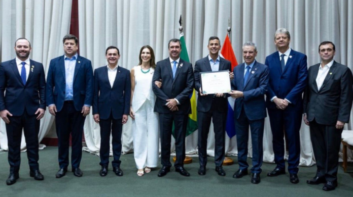 Na oportunidade, ao lado do governador Eduardo Riedel, Paulo Corrêa entregou o Título de Ilustre Visitante ao presidente do Paraguai, Santiago Peña, em reconhecimento à parceria que tem sido fundamental para o avanço da Rota Bioceânica e para o crescimento de Mato Grosso do Sul.