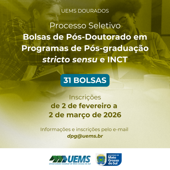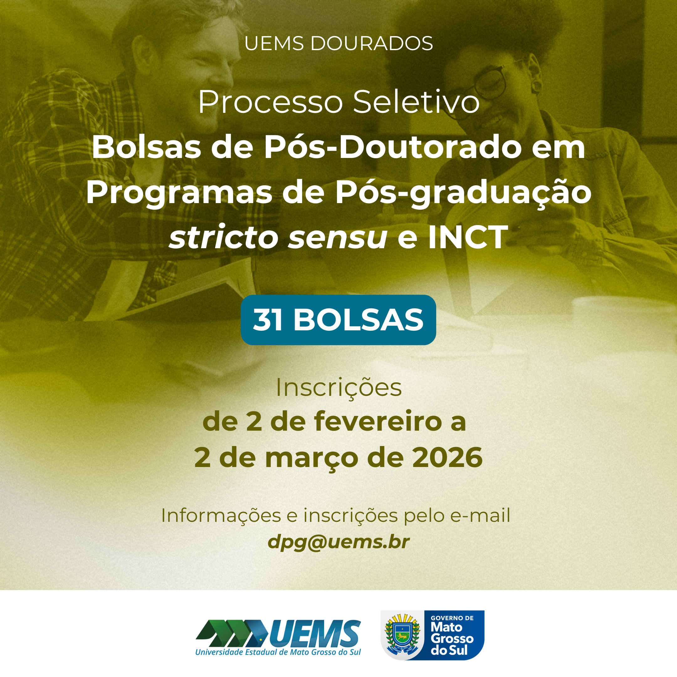• A Universidade Estadual de Mato Grosso do Sul (UEMS), por meio da Pró-Reitoria de Pesquisa, Pós-Graduação e Inovação (PROPPI), lançou a Chamada nº 001/2025 para a seleção de pesquisadores interessados em bolsas de Pós-Doutorado vinculadas aos Programas de Pós-Graduação stricto sensu e aos Institutos Nacionais de Ciência e Tecnologia (INCT) da instituição.