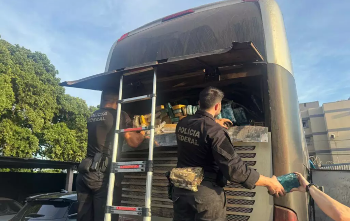 Ônibus que transportava cerca de 30 bolivianos foi apreendido pela Polícia Federal com 745 quilos de pasta base de cocaína em Campo Grande. A droga estava escondida em compartimentos ocultos no bagageiro e na parte traseira do veículo. Dois brasileiros responsáveis pelo transporte do entorpecente foram presos em flagrante. A ação ocorreu na manhã desta sexta-feira (20).