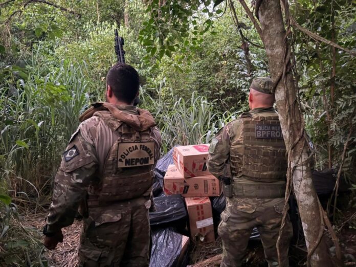 Guaíra/PR. Nesta sexta-feira (13/03), durante patrulhamento de rotina na área rural de Guaíra/PR, policiais federais e policiais militares do BPFron do Paraná apreenderam 19 caixas de cigarros de origem paraguaia em uma trilha.